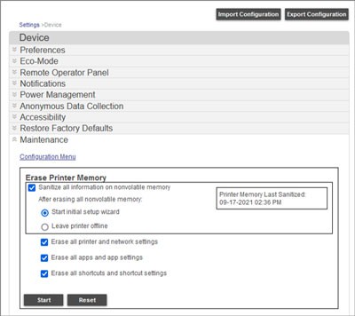 - Capture all configuration settings for apps, e-mail, fax, copy, print, network, and security functions.