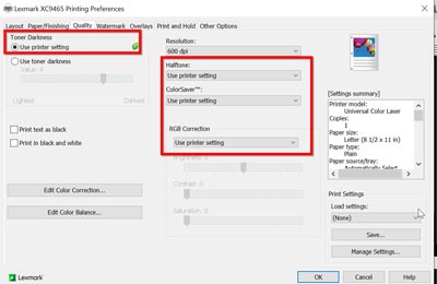- Before printing a document, open the print menu and go toPropertiesthen select theQualitytab.Make sure to set the following settings toUse printer settingthen click OK: