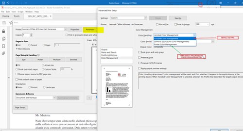 The default settings used in the Adobe Acrobat print menu can affect the color output of the printer and color settings.