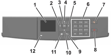 1 | 显示 | 查看打印机状态和消息。 设置和操作打印机。 |