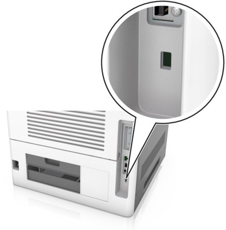 打印机配置了安全锁特性。当安装了与大多数笔记本电脑兼容的锁后,打印机就被锁定了。锁定后,控制器板挡板和控制器板不能被拔出。在显示的位置为打印机安装安全锁。