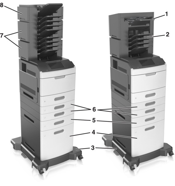 地板安装的配置需要额外的装置来保证稳定性。如果使用多个输入选件,则必须使用打印机支架或打印机底座。如果你购买的打印机具有类似的配置,则你可能需要额外的装置。如需更多信息,请参阅 www.lexmark.com/multifunctionprinters。