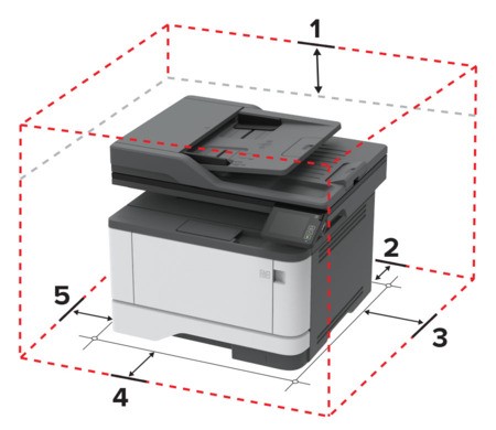 1顶部305 毫米(12 英寸)2后部100 毫米(3.94 英寸)3右侧76.2 毫米(3 英寸)4前部305 毫米(12 英寸)打印机前部所需的最小空间是 76 毫米(3 英寸)。5左侧110 毫米(4.33 英寸)